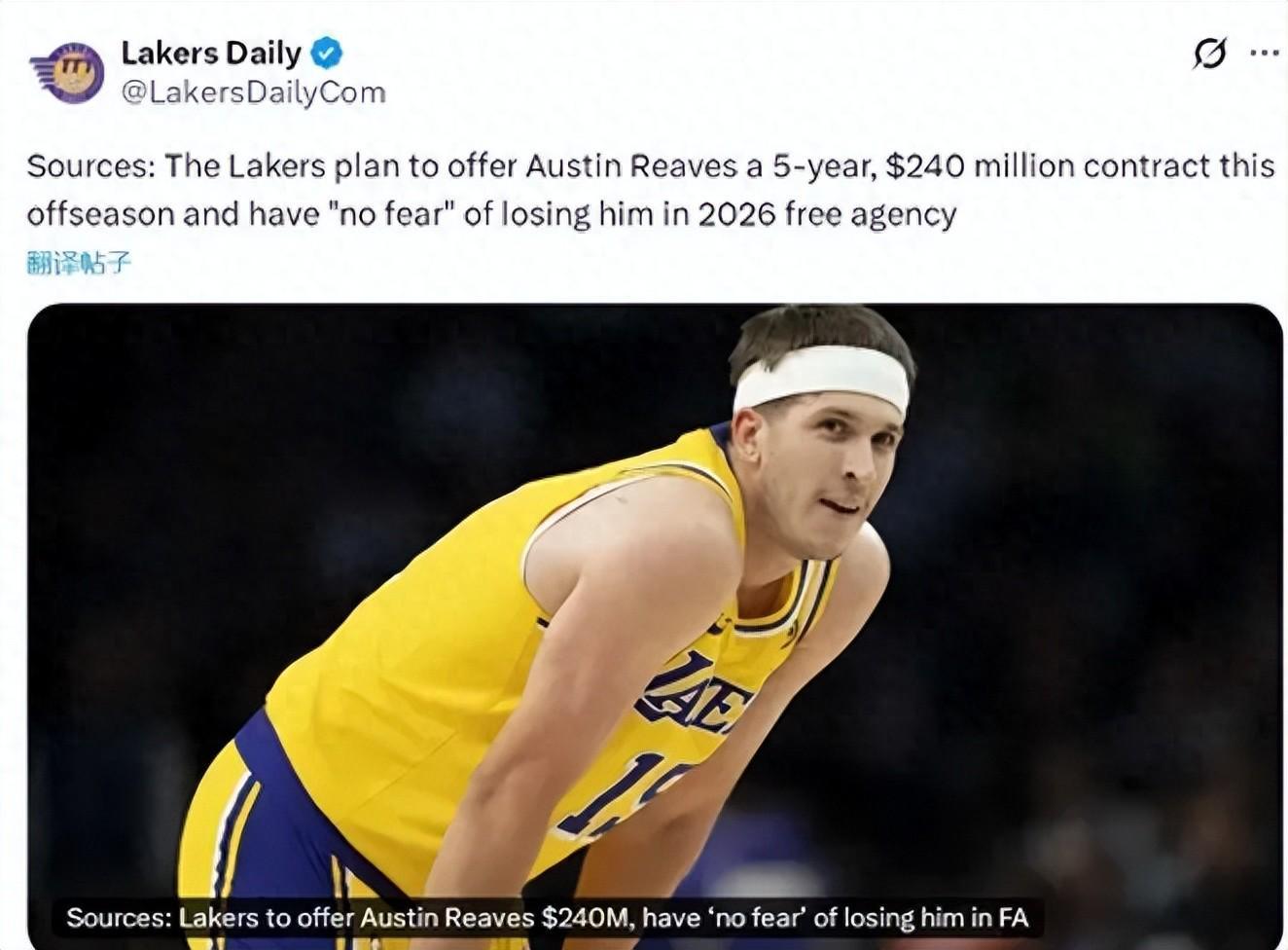 北京时间3月12日,据洛杉矶当地媒体《Lakers Daily》报道,联盟多位消息人士透露,湖人准备在今年夏天为里夫斯提供一份为期5年总额高达2.4亿美金的长约合同。