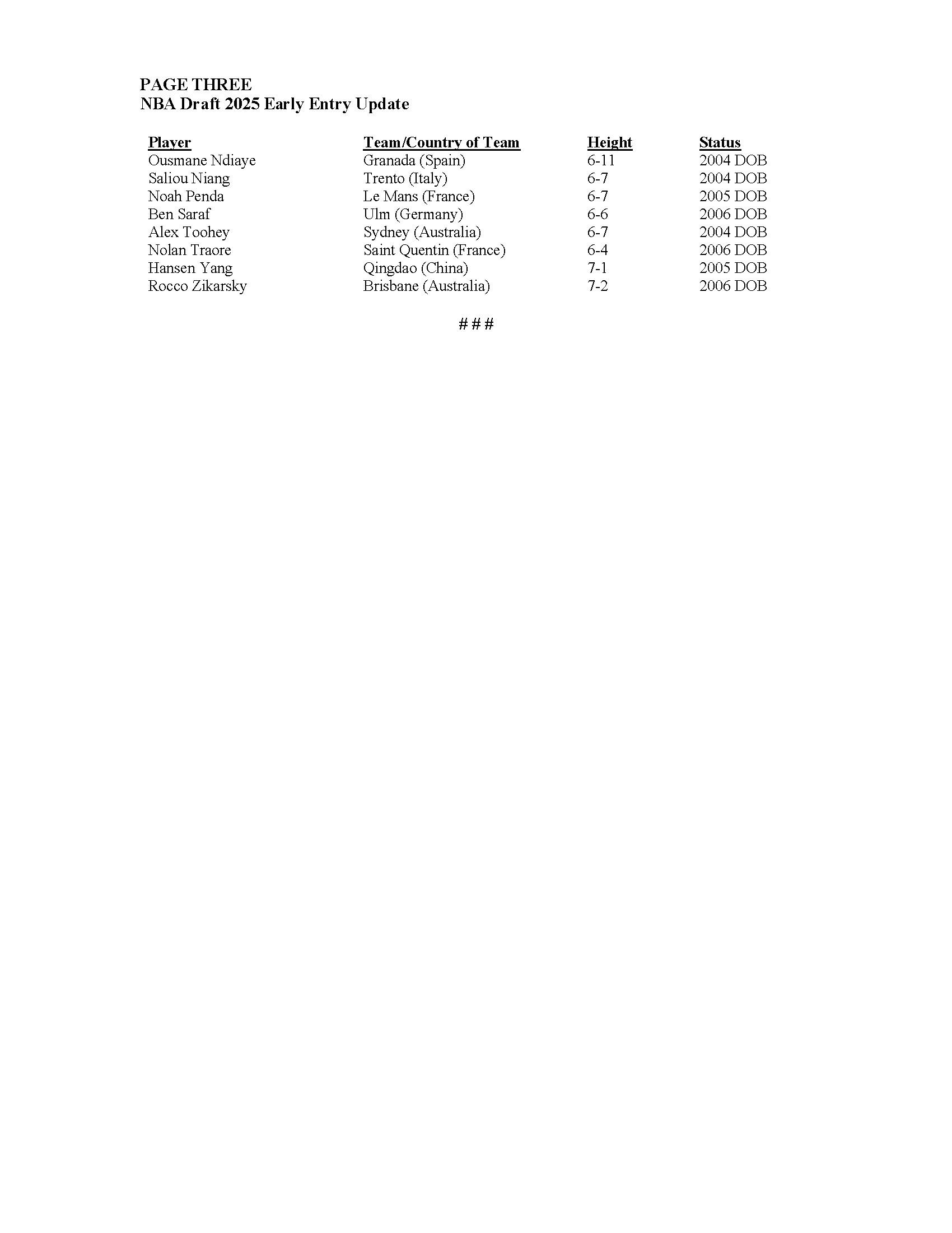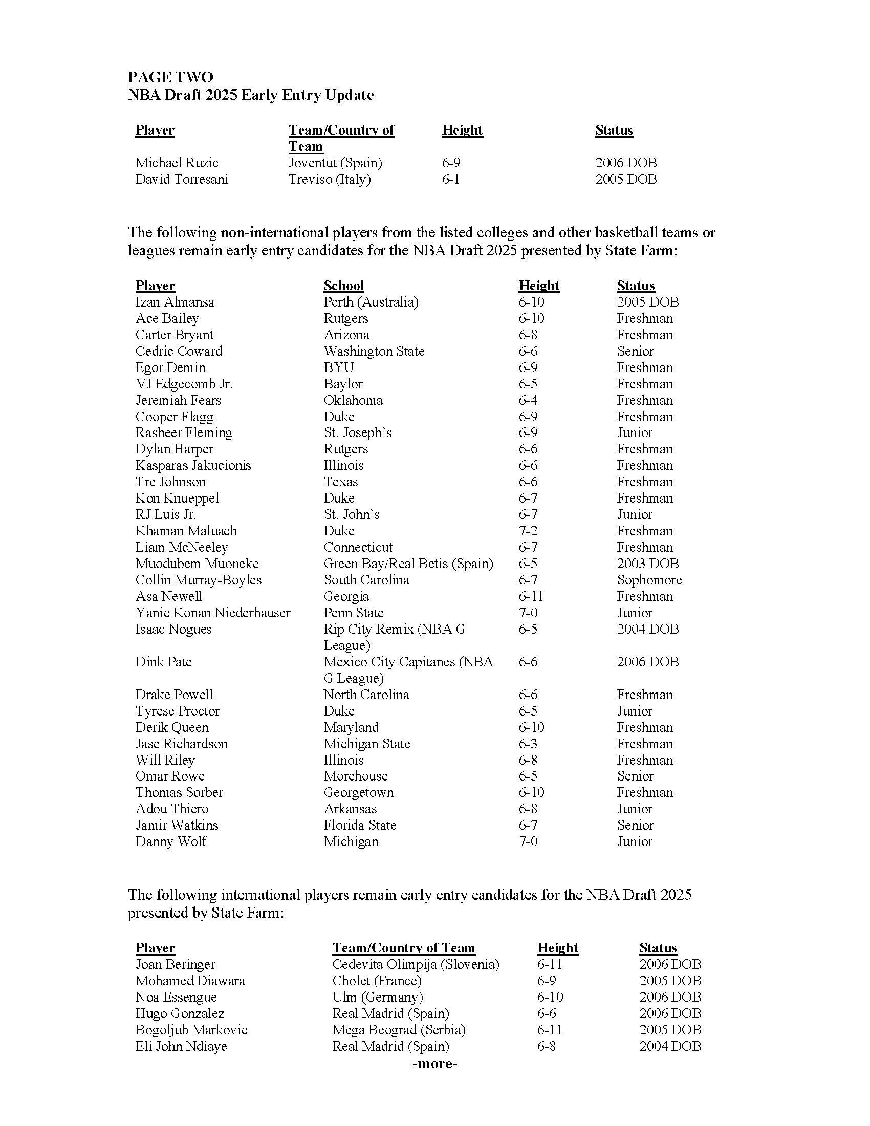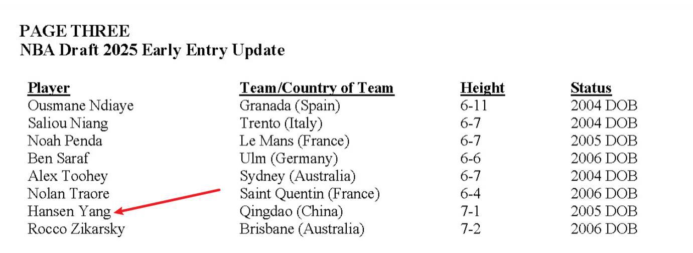 直播吧06月18日讯 NBA今日官宣最终提前参选球员名单,最终本届提前参选球员剩余人数46人,包括32名来自NCAA、其他联盟的球员以及14名国际球员,杨瀚森在14名国际球员行列之中!