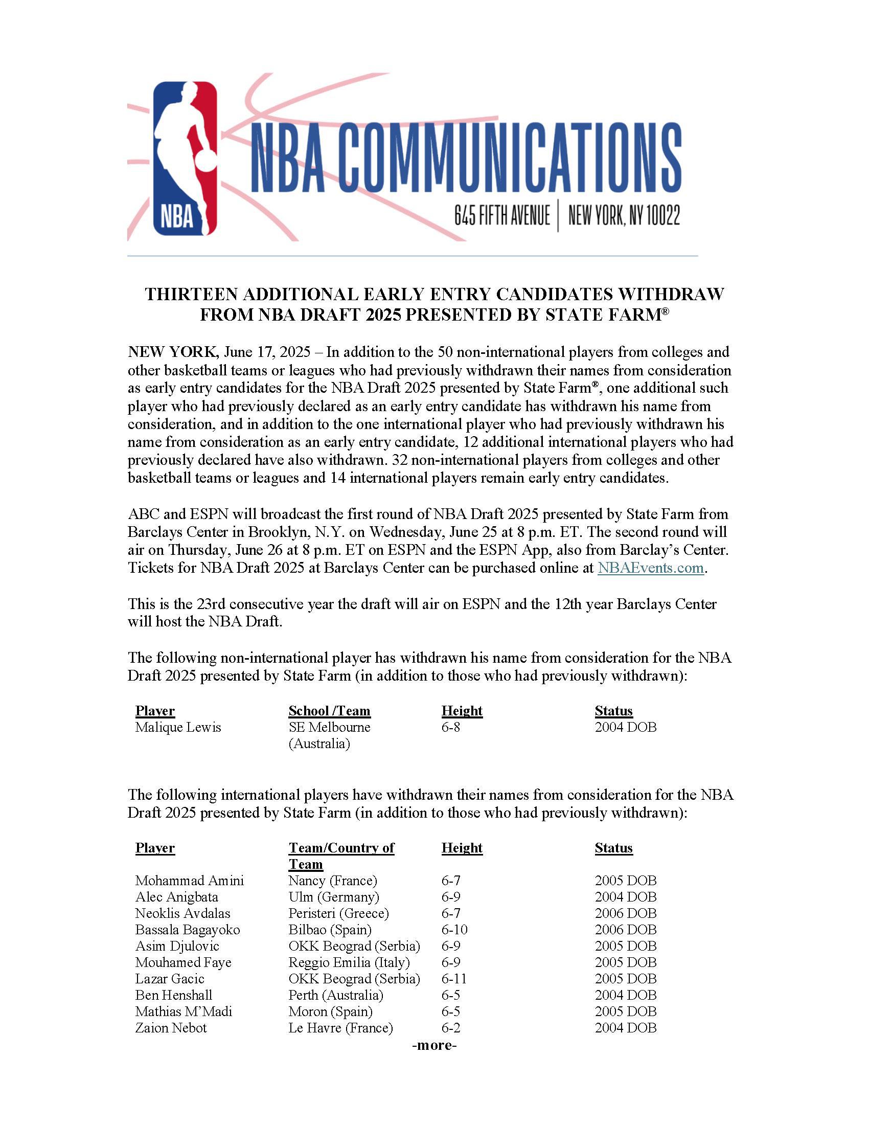 2025年选秀大会将于北京时间6月26日(首轮)、6月27日(次轮)分两天举行。